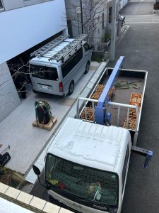 今回は搬入に「炎力屋」の次男坊君に来てもらい、UNIC車での搬入になりました。普段全くUNIC車は使わずに人力で2階まで搬入するのですが、今回は階段の狭さで断念、ちょうど2階ベランダから搬入がスムーズだったので次男坊の力を借りることになったのです。